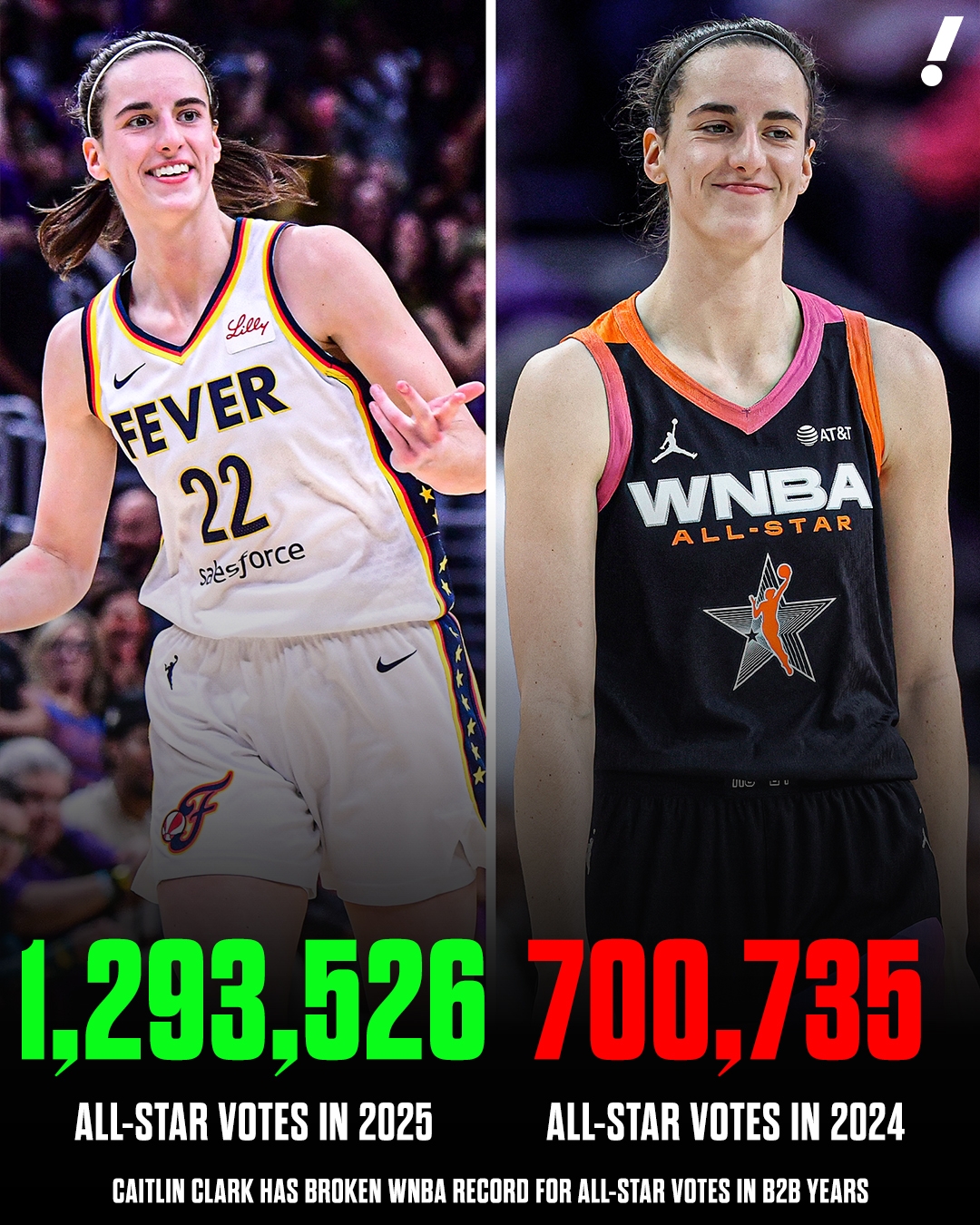 值得一提的是,在近4年WNBA全明星票王得票数方面,克拉克直接断档领先——22年阿贾8.8万、23年阿贾9.5万、24年克拉克70万、25年克拉克129万!而有意思的是,2023年全明星得票Top30球员的票数总和,也不过117万。