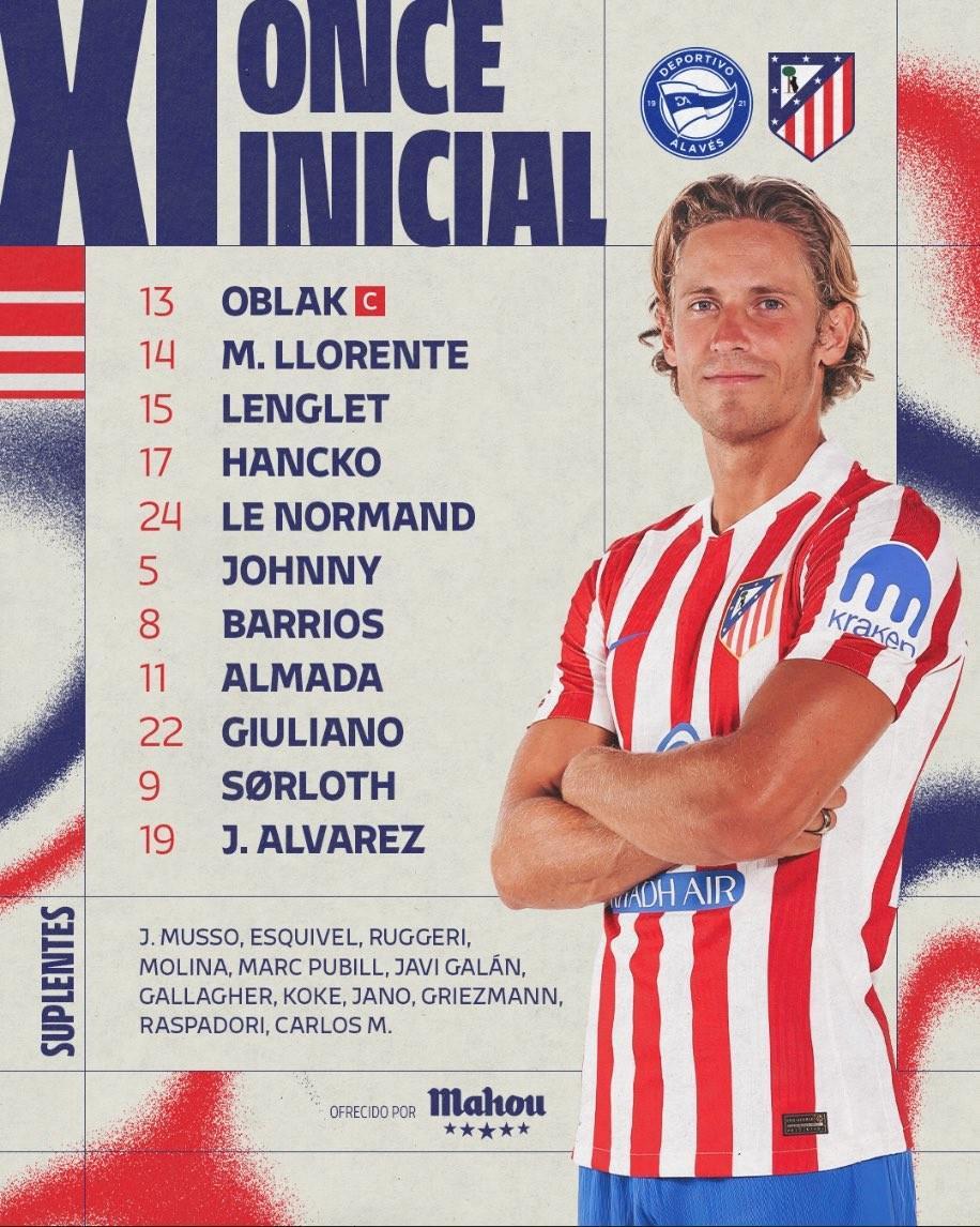 北京时间8月30日23:00,西甲第3轮,马竞客场挑战阿拉维斯。赛前,双方首发公布如下: