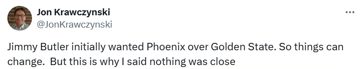对此,森林狼记者Jon Krawczynski更新动态发文写道:“巴特勒起初更倾向于加盟太阳而非勇士,所以情况可能会发生变化,但这就是我所说的目前尚无任何交易接近达成的原因。”