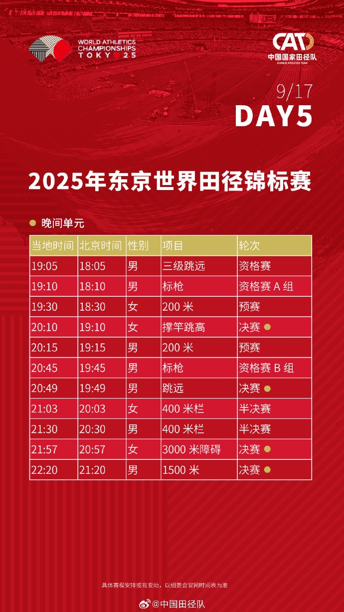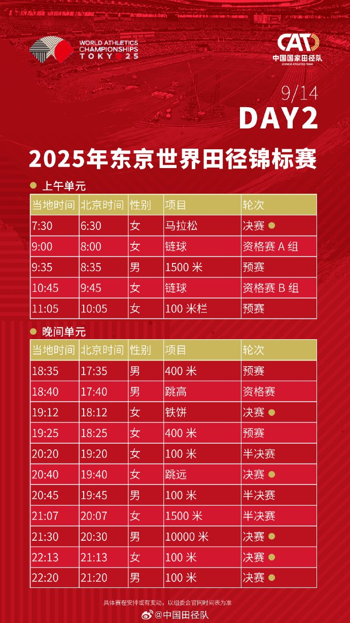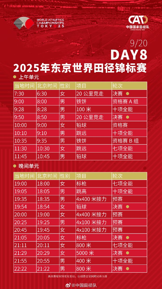 #2025东京田径世锦赛赛程# 中国田径队将派出73名运动员(男运动员41人、女运动员32人),参与田径世锦赛33个小项的比拼。