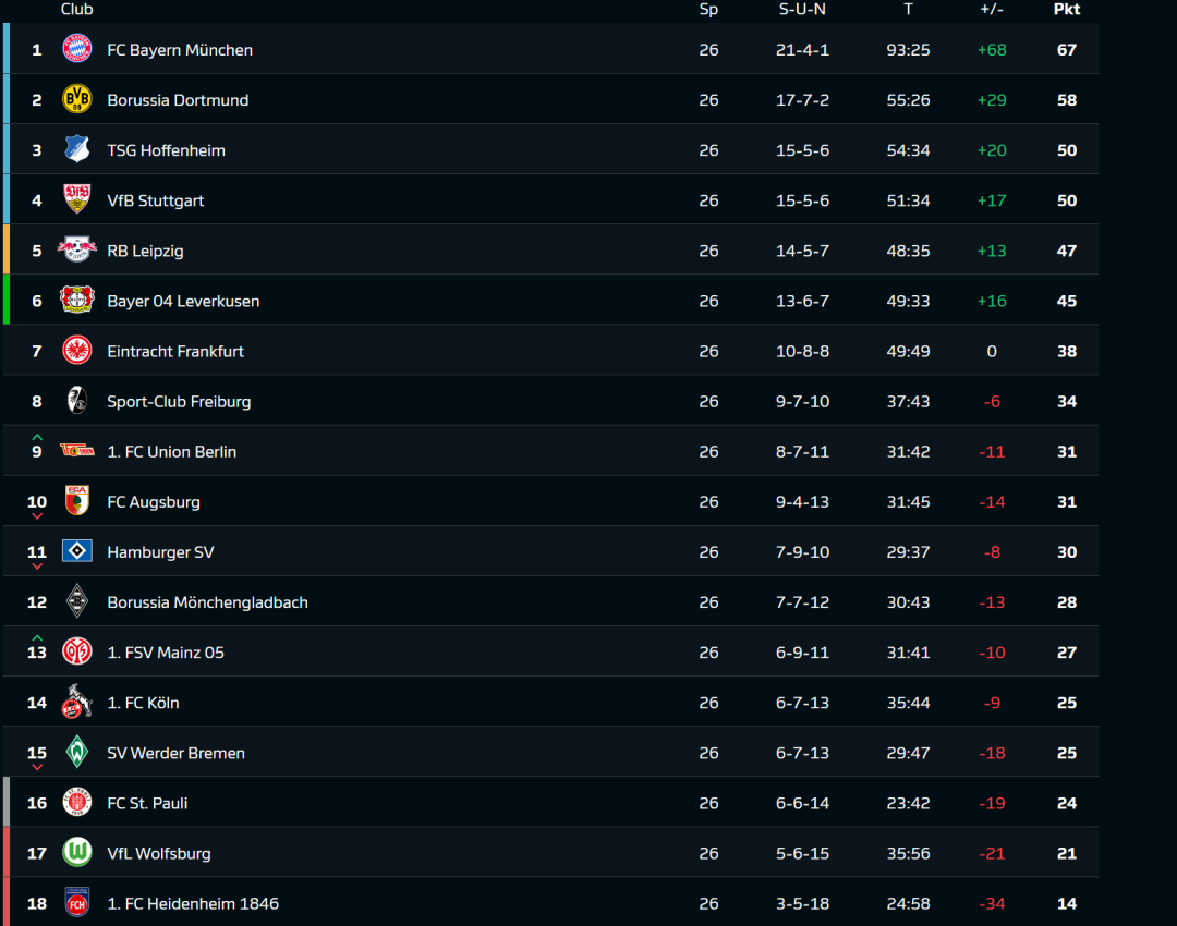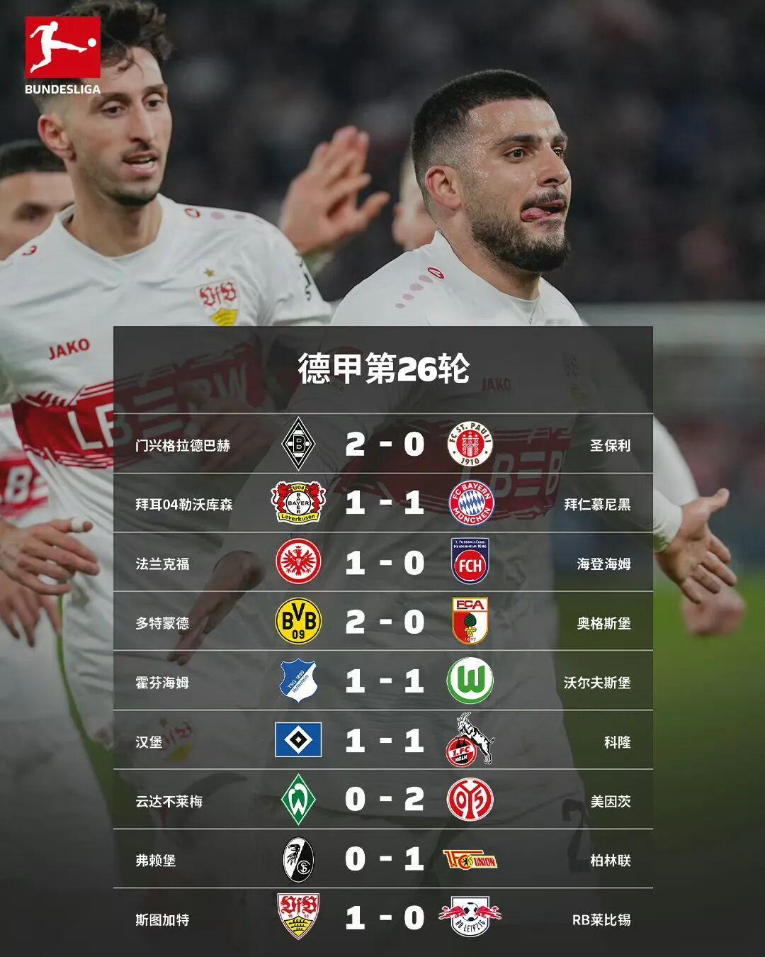 随着北京时间3月16日凌晨进行的欧冠席位的关键争夺战中,斯图加特1比0力克莱比锡,德甲第26轮全部比赛全部结束。被罚下2人的拜仁慕尼黑,在客场1比1艰难逼平勒沃库森;而多特蒙德2比0击退前来造访的奥格斯堡,将与拜仁的分差缩小至9分;霍芬海姆战平沃尔夫斯堡后积50分,而斯图加特赢球后积分也来到了50分,因净胜球劣势屈居第四;RB莱比锡积47分排名第五,勒沃库森积45分,本轮遗憾错失了反超莱比锡的机会。