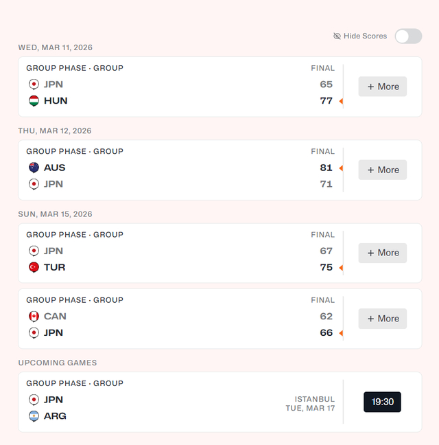 首战日本队65-77惨败匈牙利队、第二场日本队71-81惨败澳大利亚队、第三场日本67-75不敌土耳其队、第四场日本66-62险胜加拿大。换言之日本只剩下VS阿根廷一场比赛了。