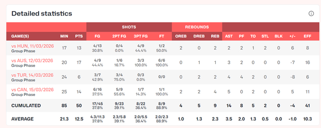他四场比赛场均21.3分钟,拿到12.5分3.5助攻2.3篮板1.3失误0.5抢断,命中率37.8%,三分命中率36.4%,效率值非常低。